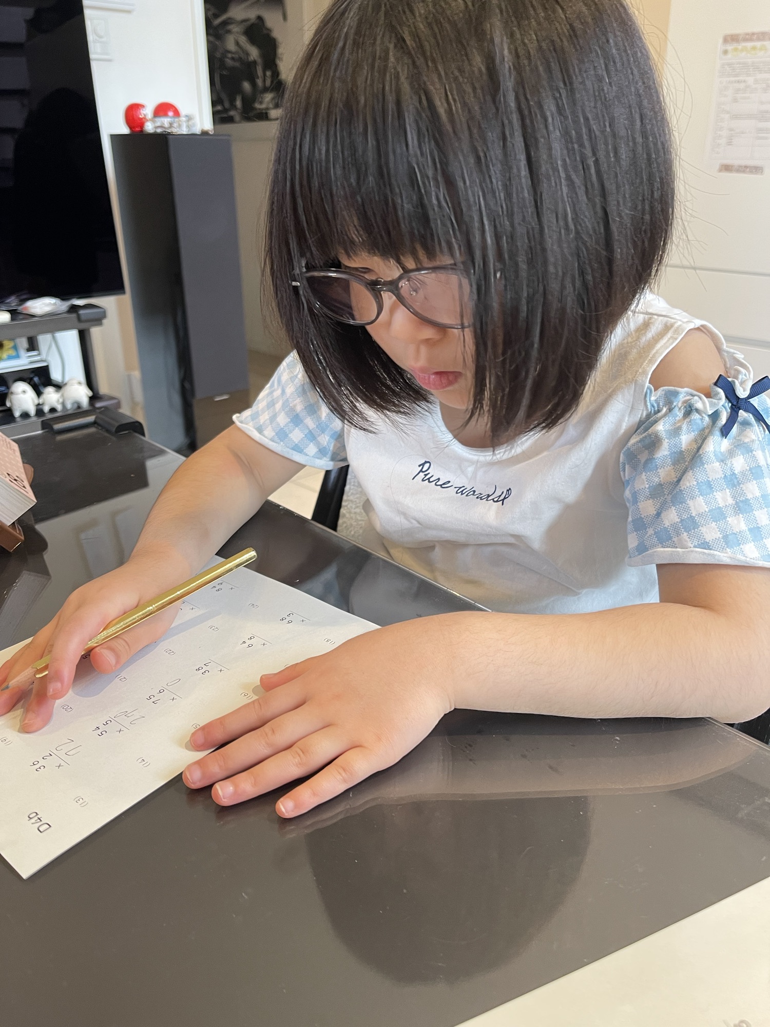 【朝学習】起床6:30。昨夜は就寝が遅かったため、少しぐだぐだ。公文国語CI31、算数かけ算とわり算一枚ずつ。