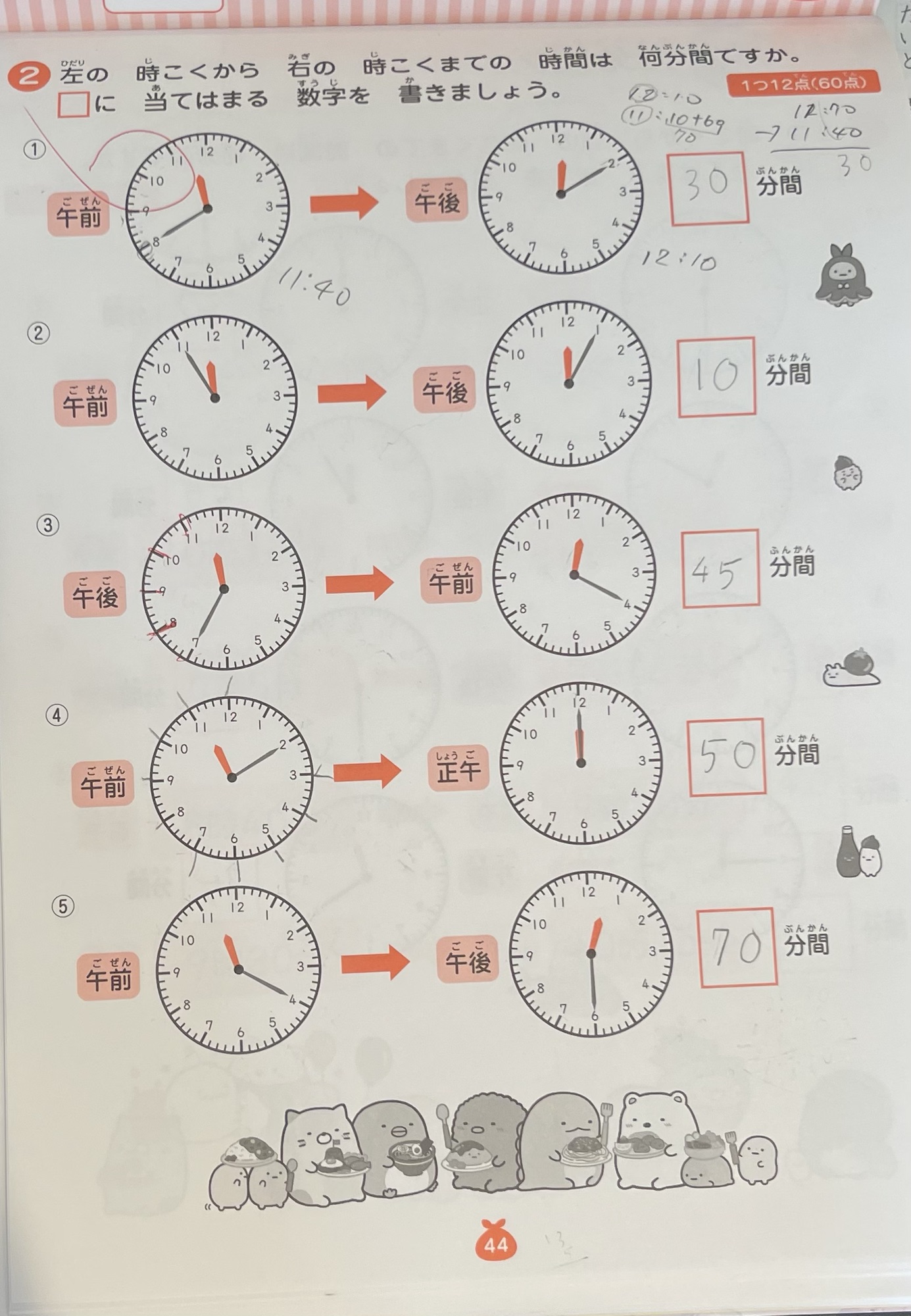 【朝学習】起床6:20。公文算数引き算とかけ算のプリント復習。公文算数D 84。すみっこ暮らしの時刻と時間のドリル。